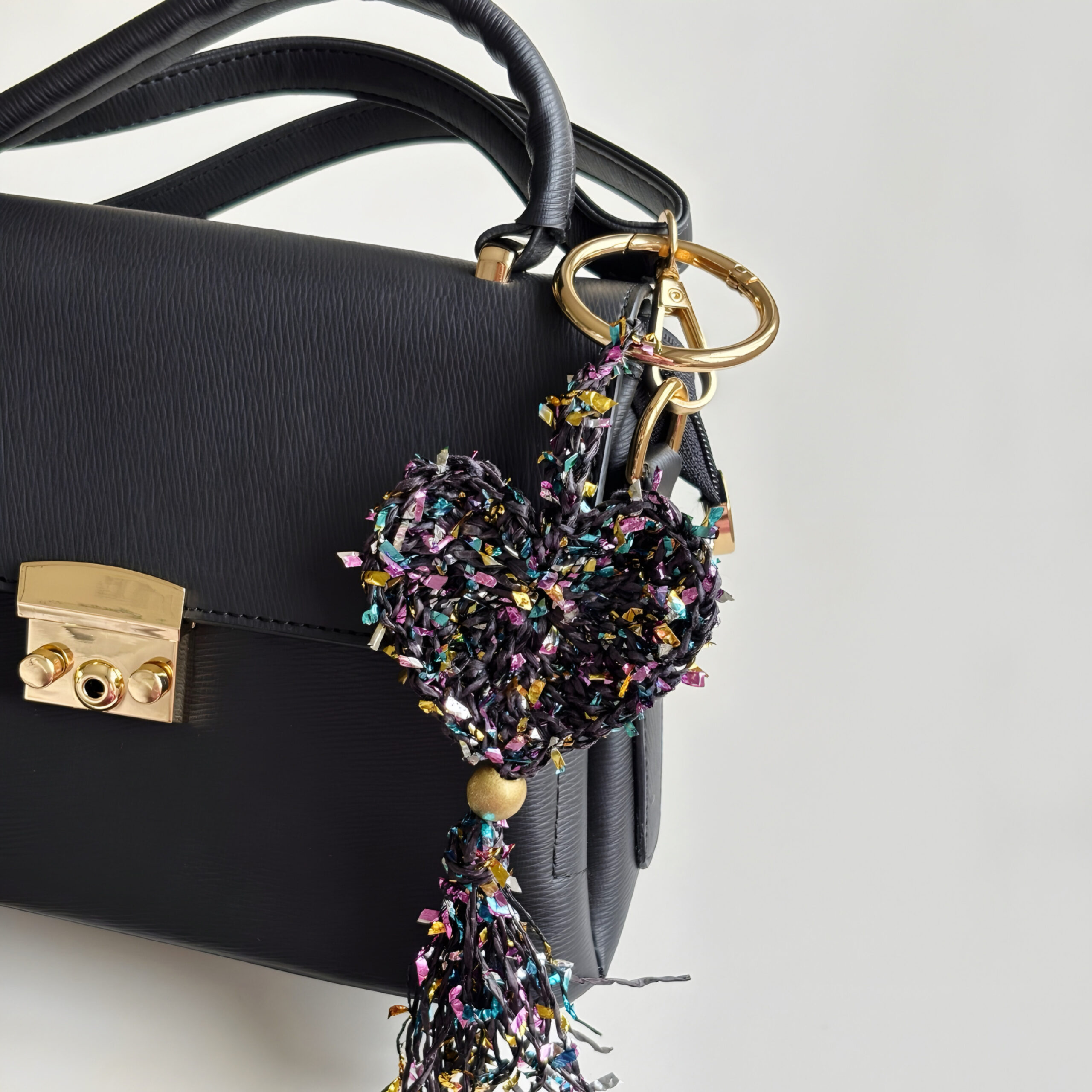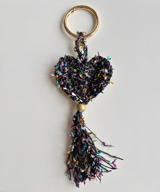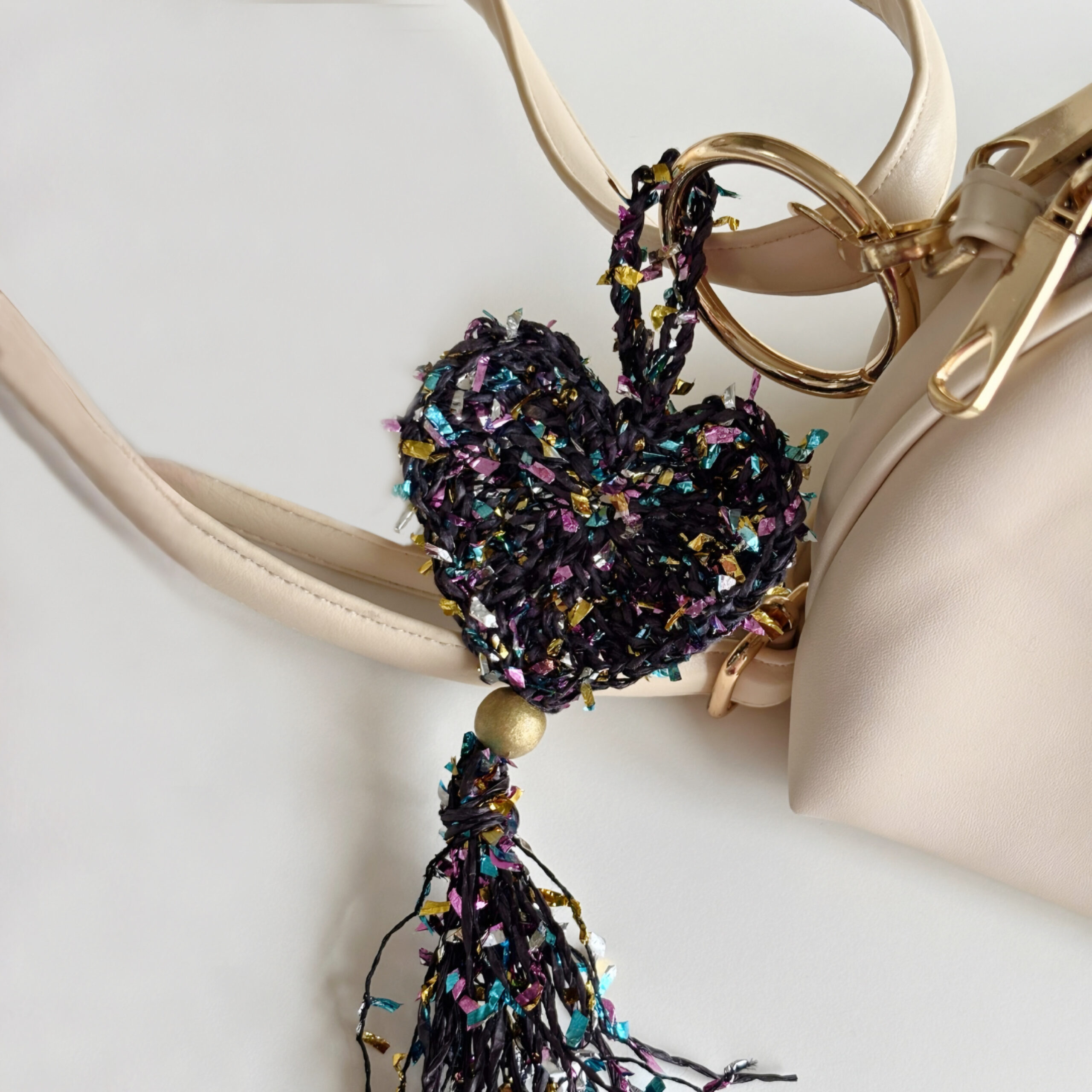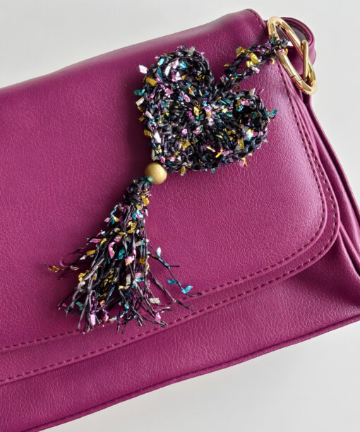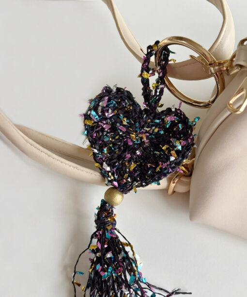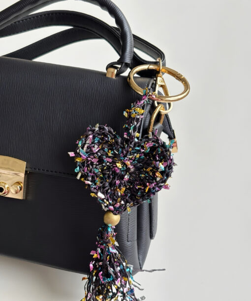 El yapımı bu özel bag charm, konfeti gibi renkli kağıt ipten örülmüş kalp formu, hareketli püskül ve yaldızlı ahşap boncuk detaylarıyla stiline enerjik ama zarif bir ışıltı katmak için tasarlandı. Her ilmeğinde neşe, her detayında sıcaklık var. Canlı renklerin dinamizmi ile altın tonlu yaylı halka ve boncuk detayının sofistike parıltısı dengeli bir uyum oluşturuyor. Hafif yapısı sayesinde çantada ağırlık yapmaz; ama bulunduğu her yerde fark edilir. Çantana karakter katmak, anahtarına enerjik bir hava vermek ya da hediye paketine unutulmaz bir imza eklemek istediğinde kusursuz bir tamamlayıcıdır.