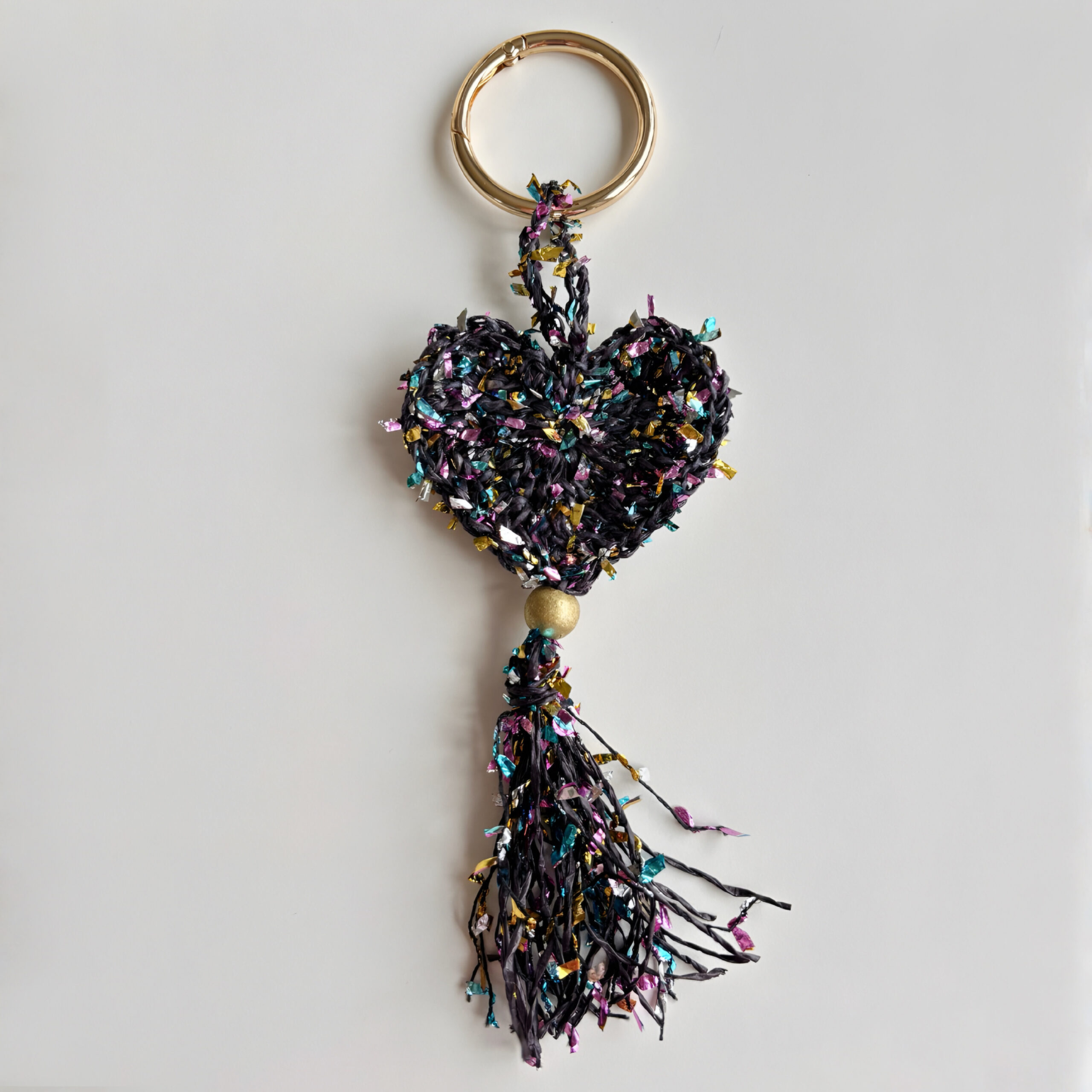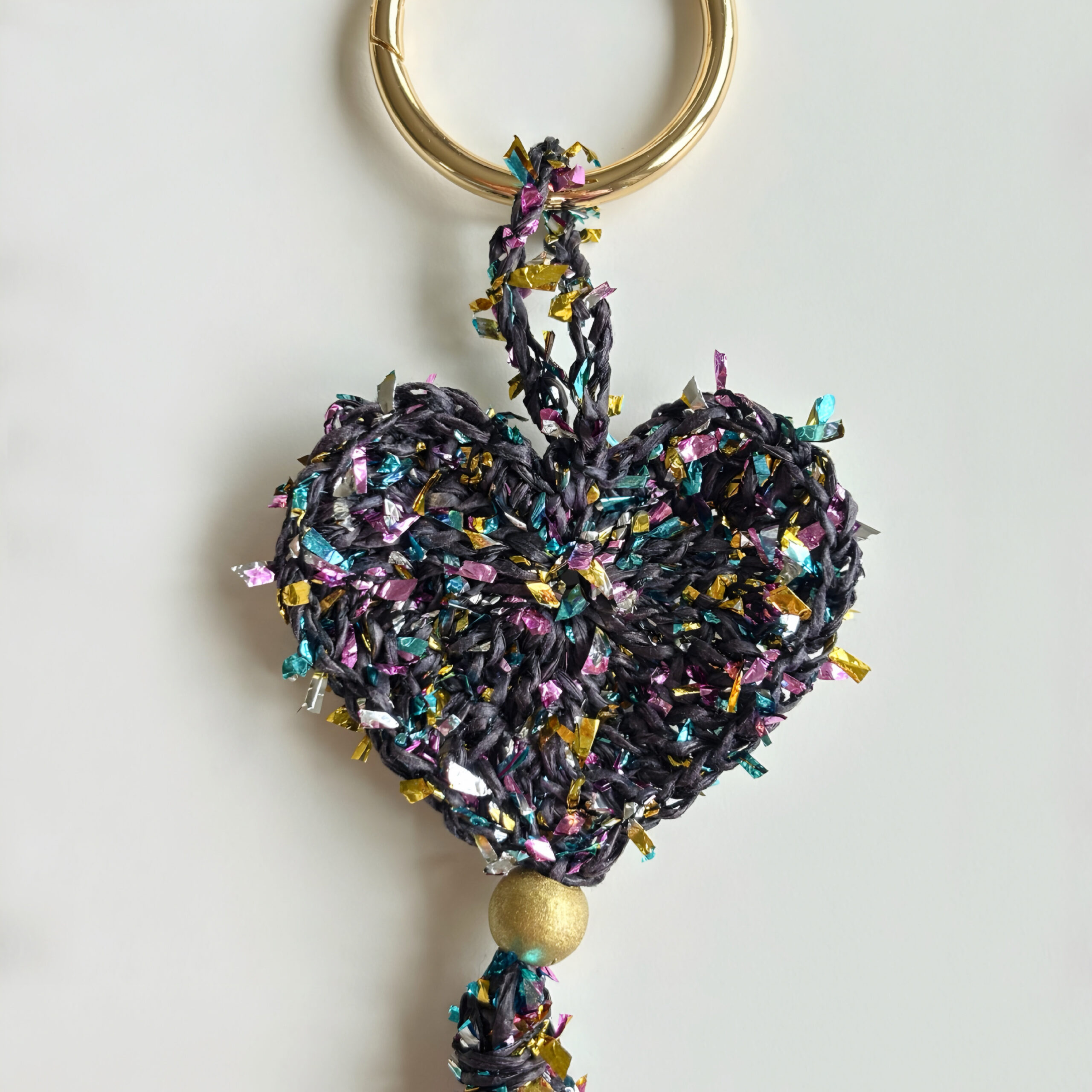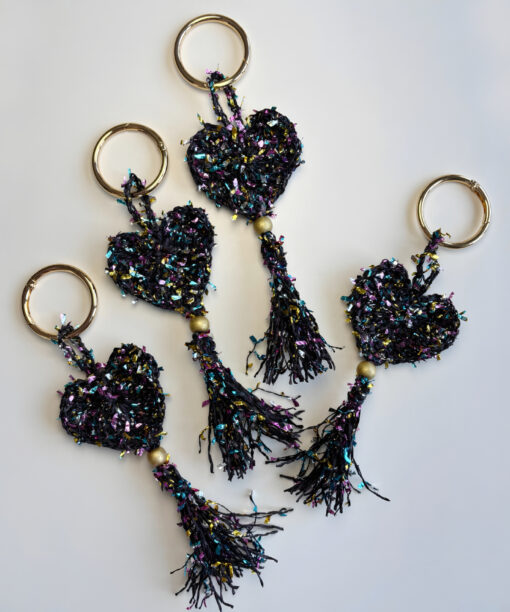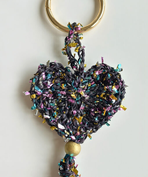 Kalp formu, renkli kağıt ip ile örgü tekniği kullanılarak oluşturulmuştur. Hareketli püskül detayları tasarıma dinamizm katarken, yaldızlı ahşap boncuk ve gold yaylı halka zarif bir ışıltı ve dengeli bir kontrast sağlar.