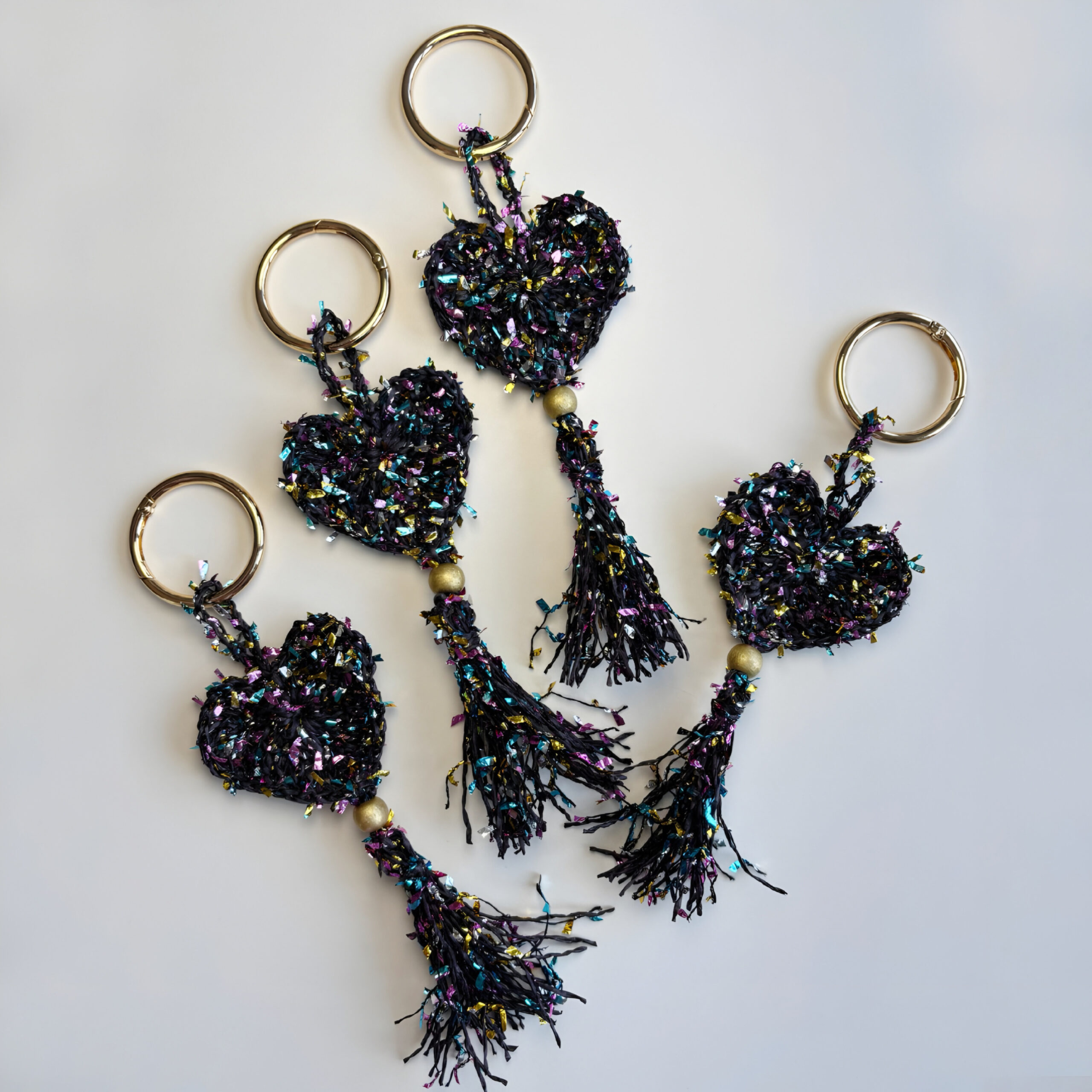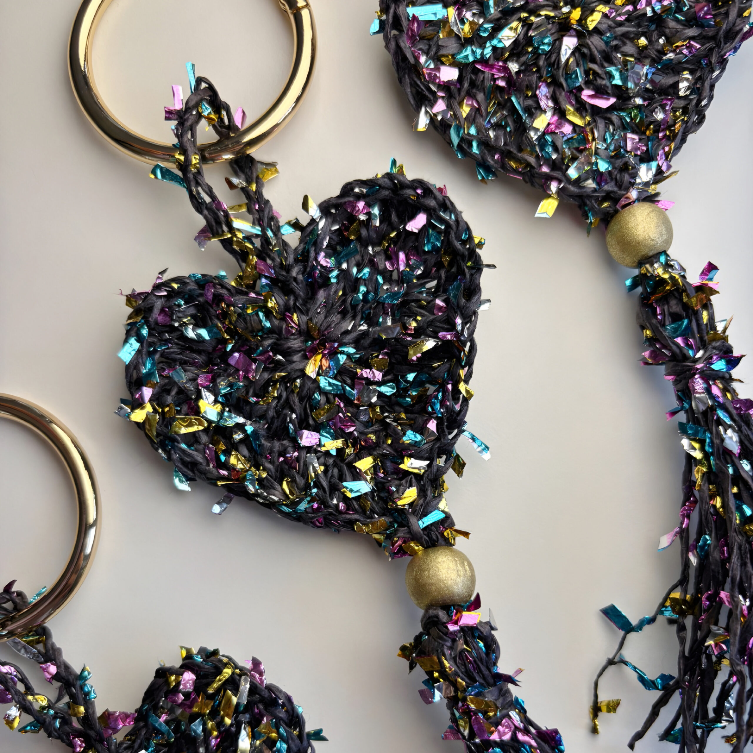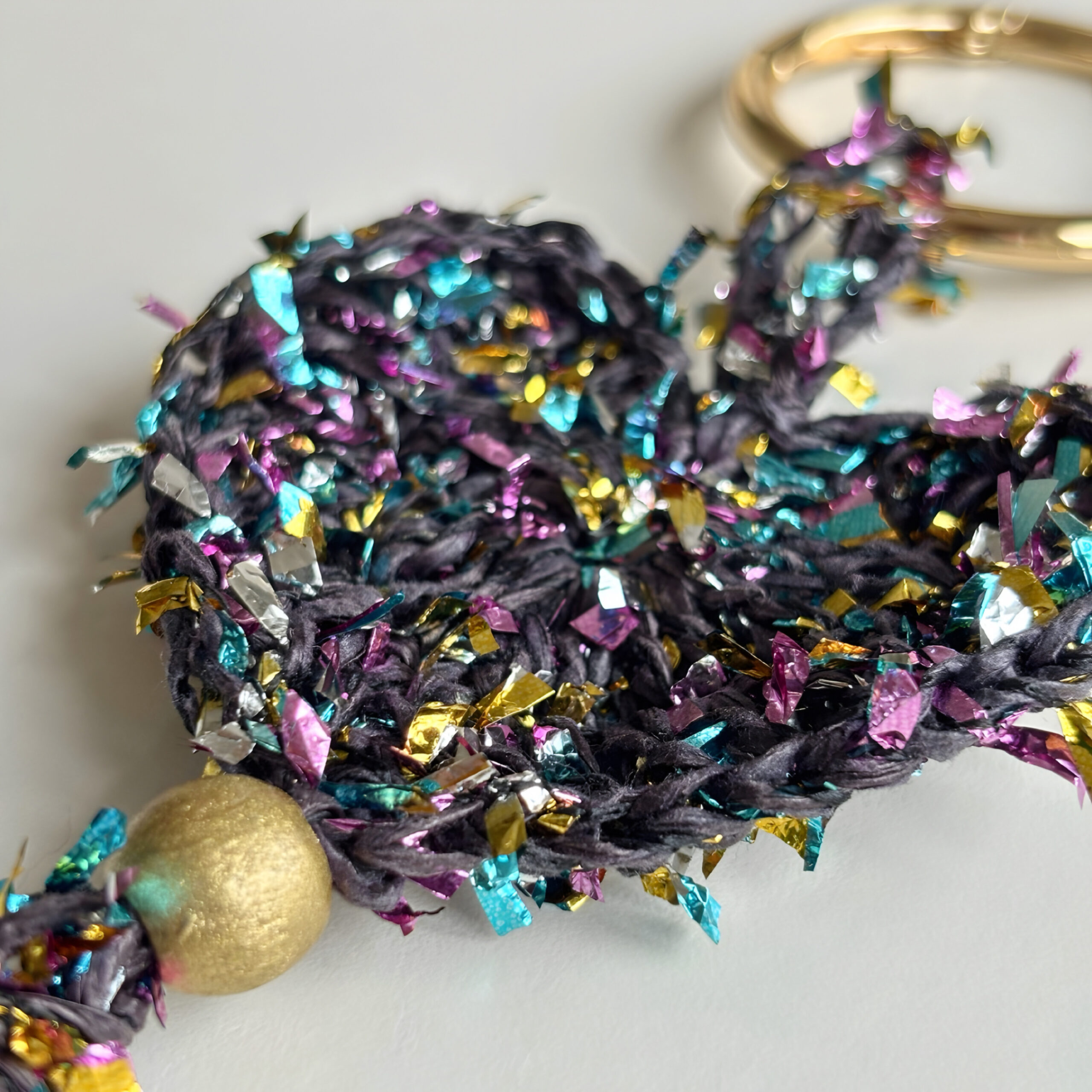 Kalp formu, renkli kağıt ip ile örgü tekniği kullanılarak oluşturulmuştur. Hareketli püskül detayları tasarıma dinamizm katarken, yaldızlı ahşap boncuk ve gold yaylı halka zarif bir ışıltı ve dengeli bir kontrast sağlar.