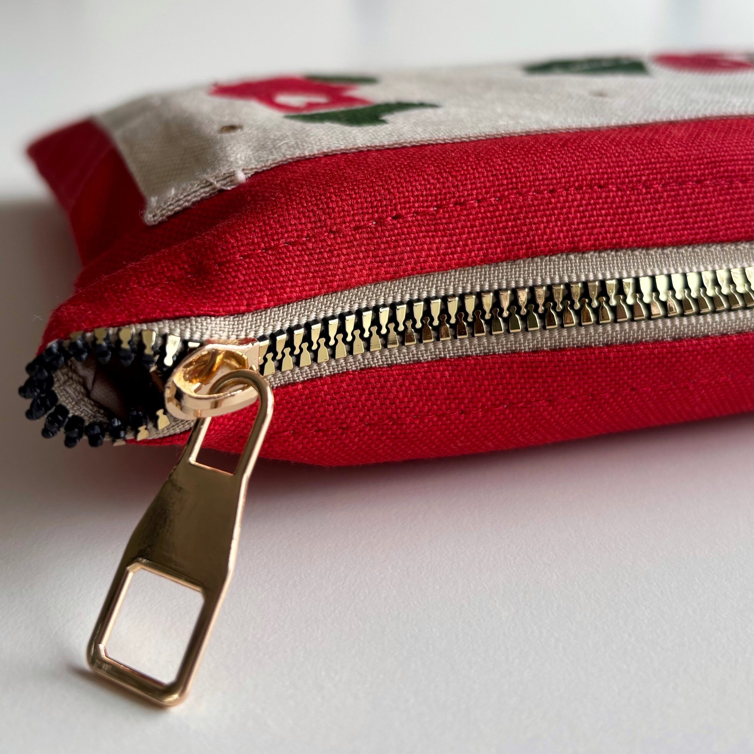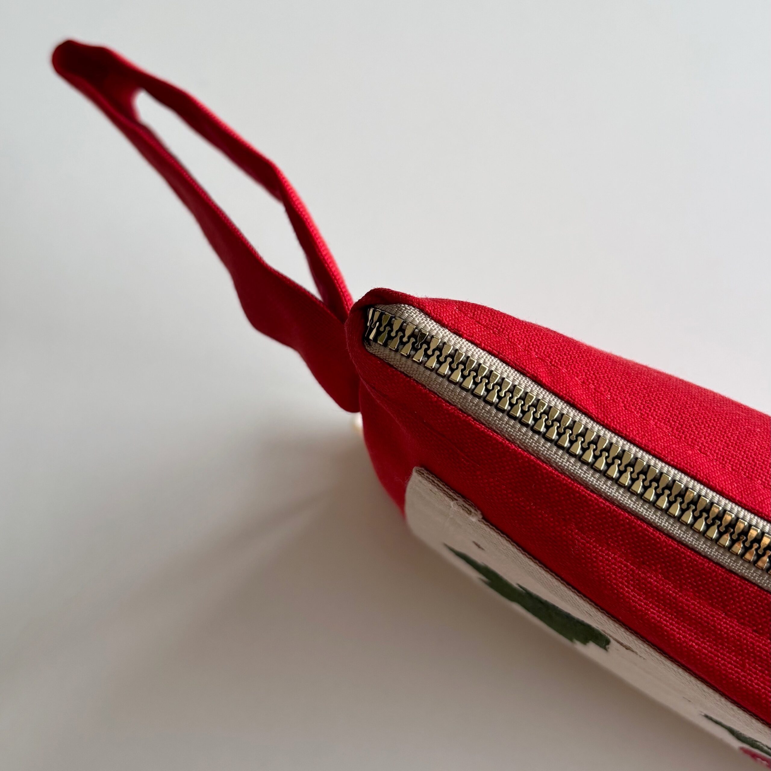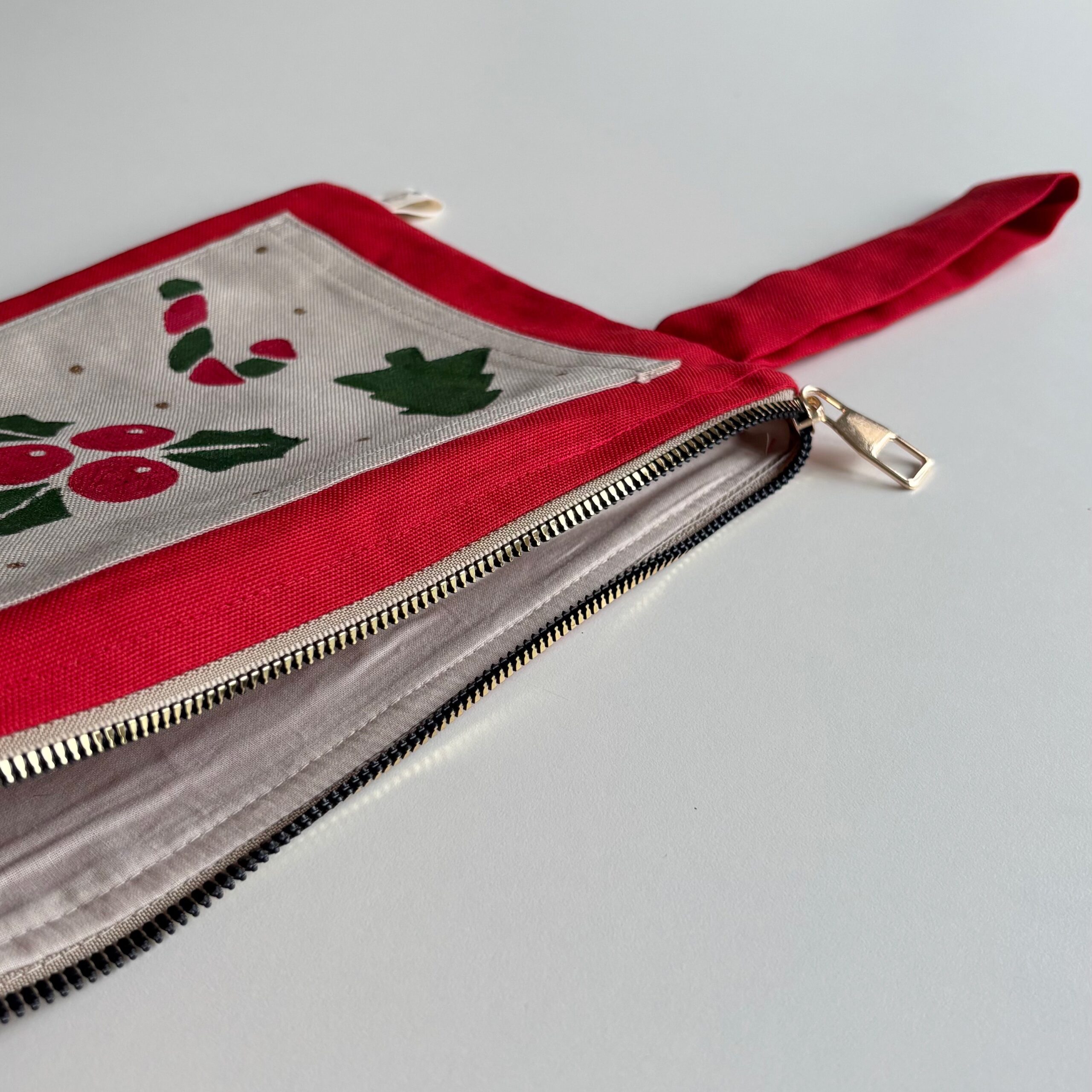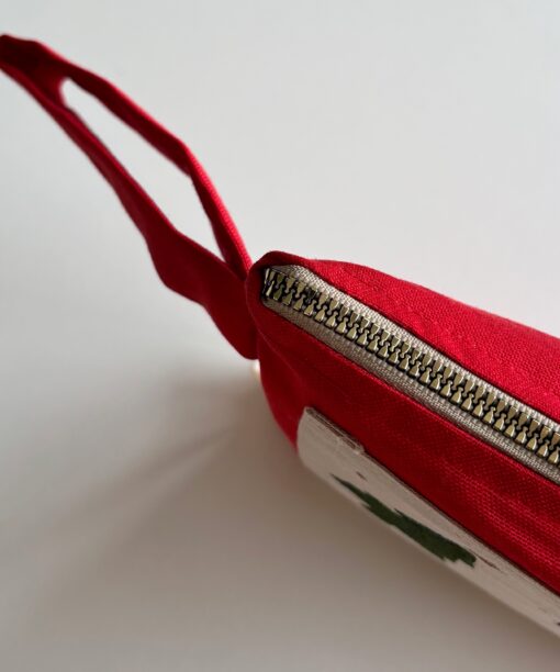 Malzeme: Pamuklu kanvas üzeri duck keten kumaş, pamuklu iç astar, metalize görünümlü sert plastik fermuar. Kumaş yüzeyindeki desen, kumaş boyasıyla uygulanan baskı tekniği ile hazırlanmıştır.