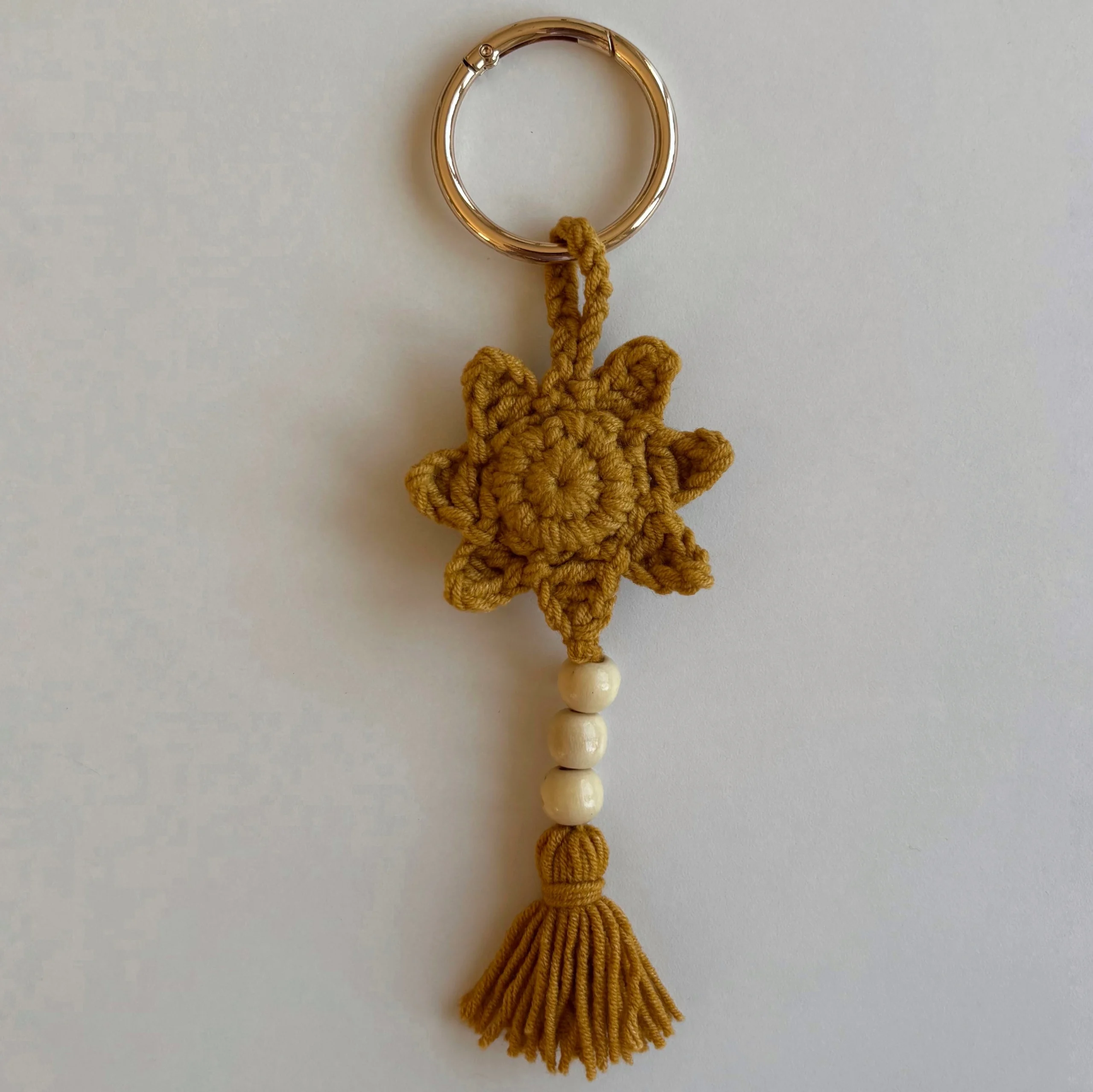 Örgü ipten özenle oluşturulan güneş figürü, hafif yapısıyla çantada ağırlık yapmaz; ahşap boncuklar ise doğal ve sıcak bir kontrast sağlar. Çantana, anahtarlığına ya da hediye paketine özel bir imza eklemek istediğinde kusursuz bir tamamlayıcıdır.