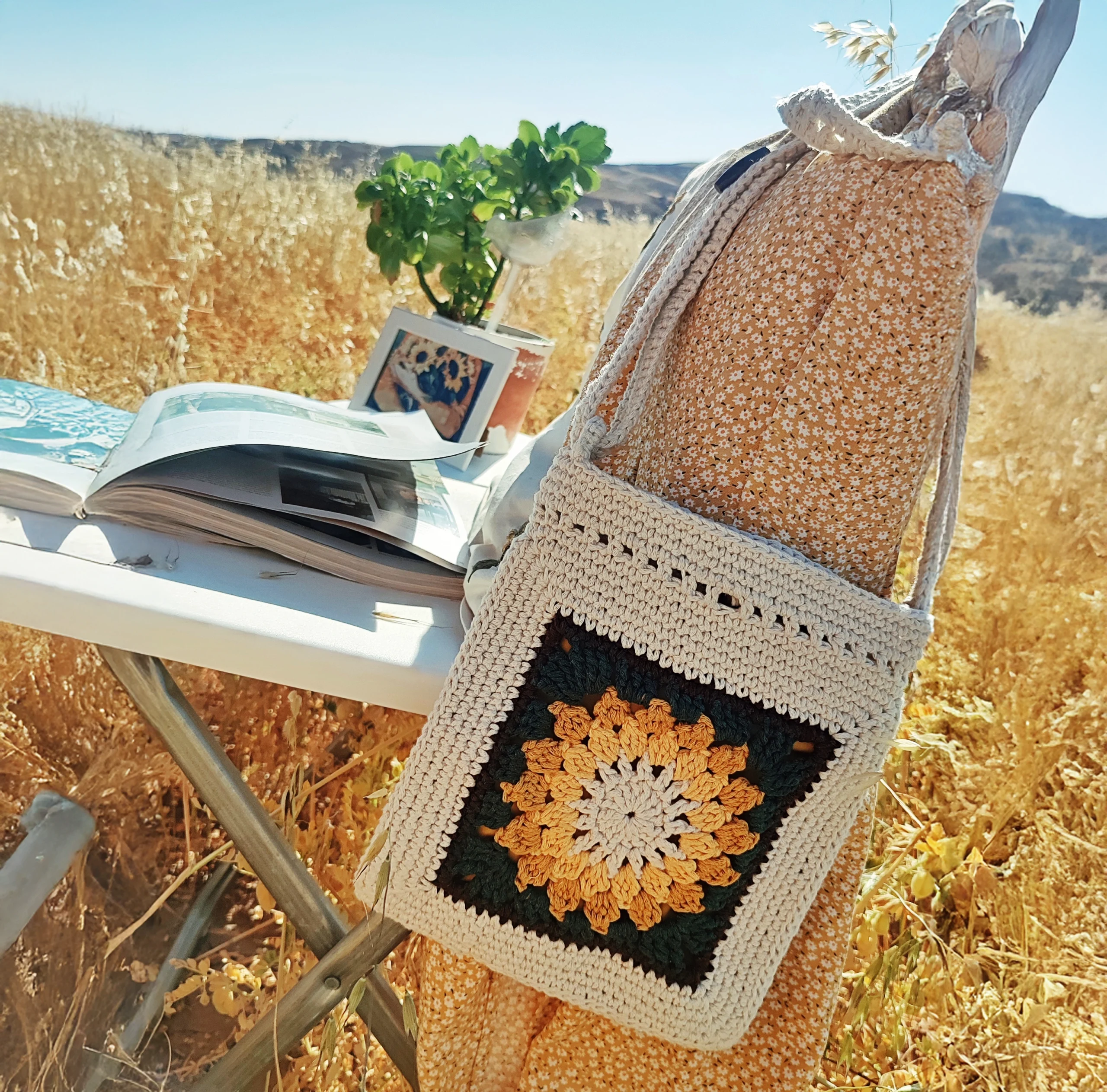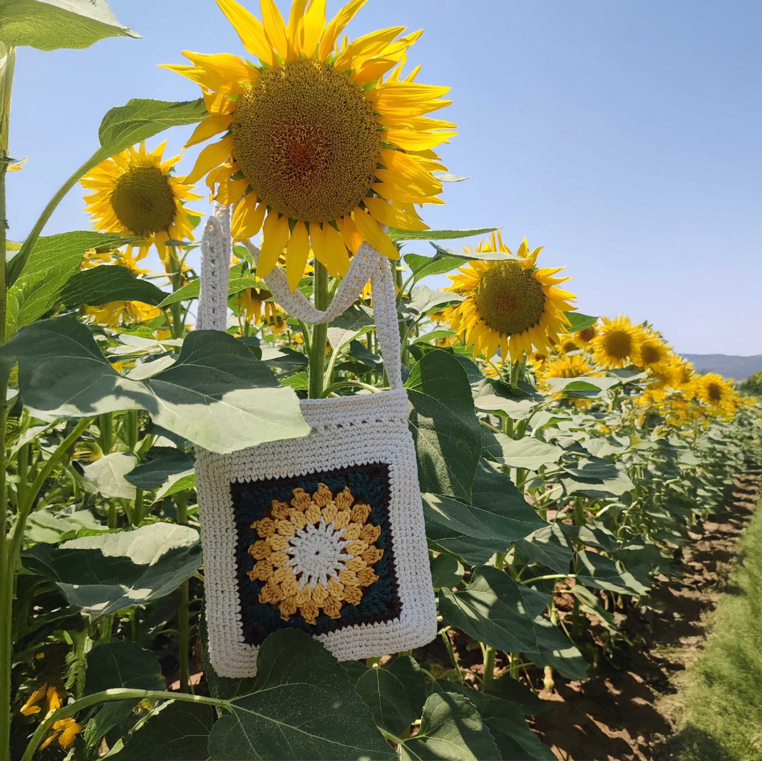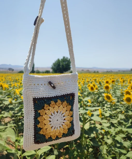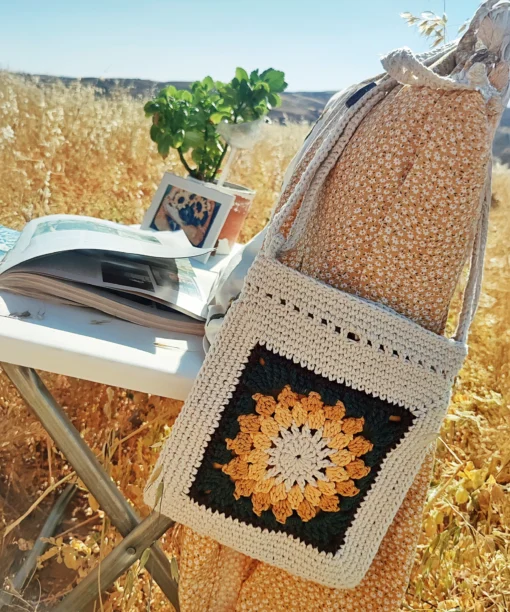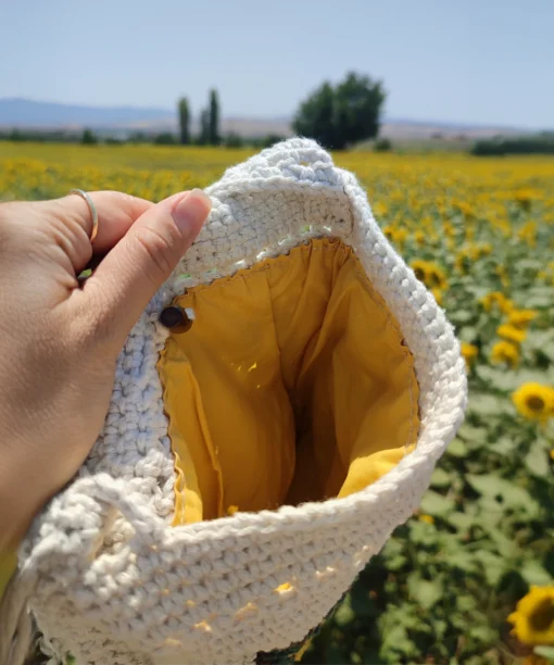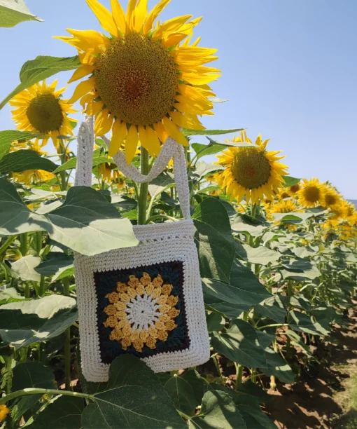 Günlük kullanıma uygun hafif ve dayanıklı yapısıyla, şehirde ya da doğada özgürce stilinizi yansıtmanızı sağlar. Bohem ve doğal stilinizi tamamlayan bu tığ işi çanta, ayçiçeğinin canlı sarı tonları ve özel motifleriyle göz alıcı bir görünüm sunar. El yapımı olması sayesinde her çanta kendine özgü bir karakter taşır; böylece modaya özgünlük katmak isteyenler için ideal bir tercih olur.